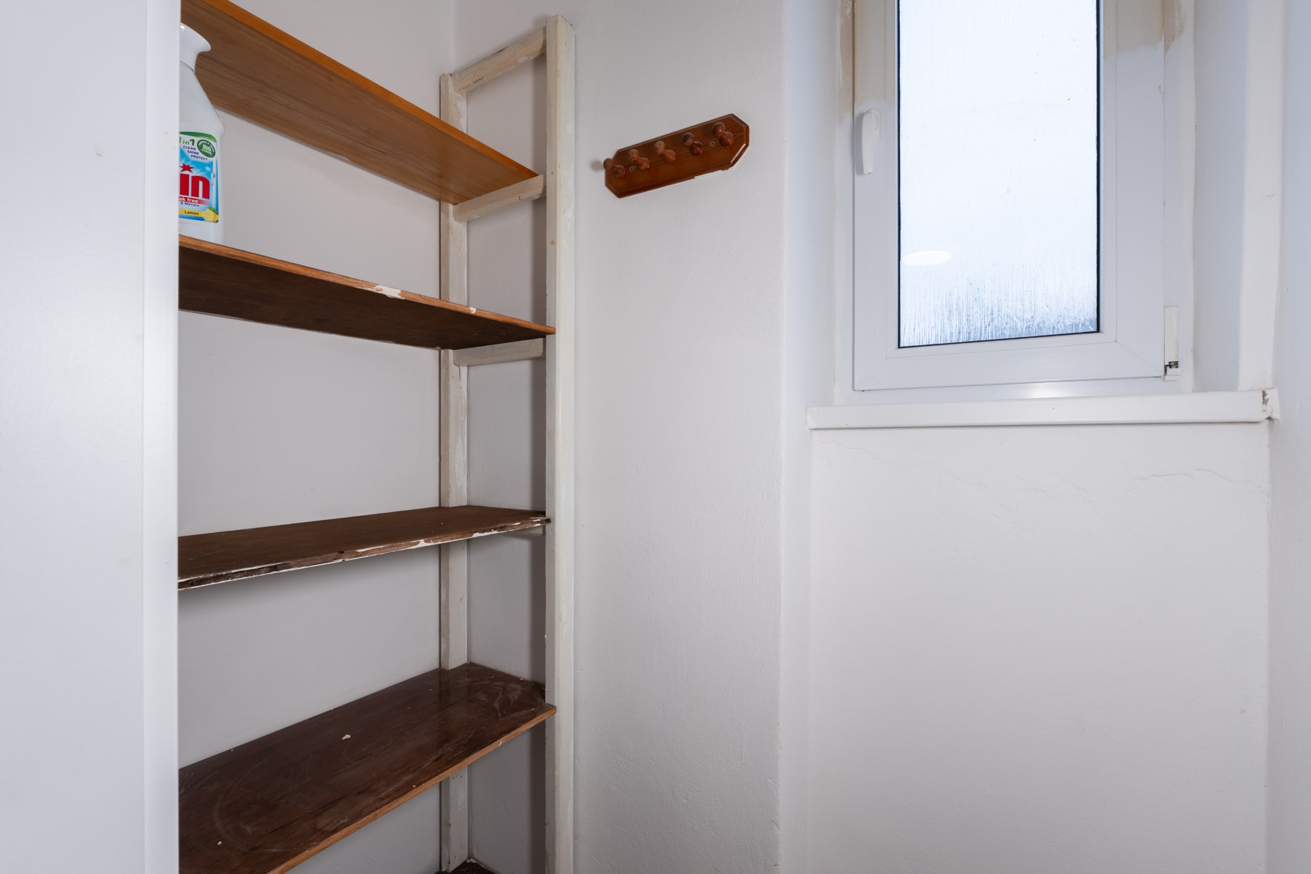 Disponuje prostornou chodbou, kde lze umístit šatní skříň. dále kuchyní s jídelnou, prostorným obývacím pokojem a taktéž prostornou ložnicí. V bytě dále nalezneme spíž a koupelnu s vanou a umyvadlem a WC. Je zde dostatek prostoru pro instalaci pračky.