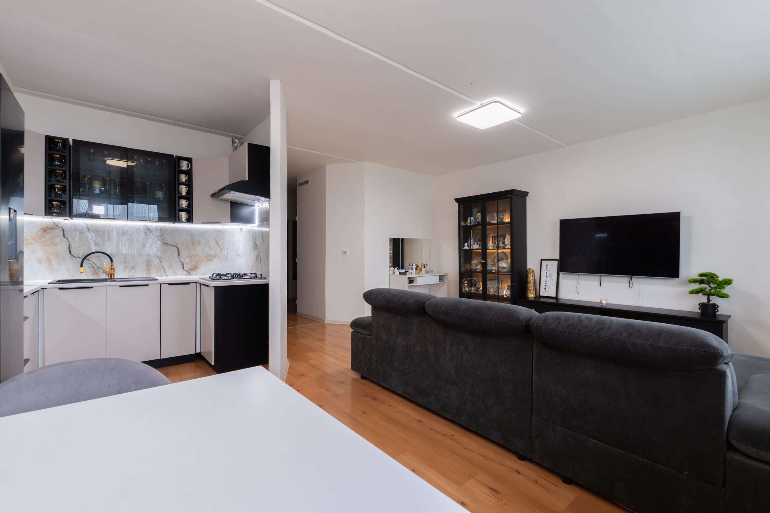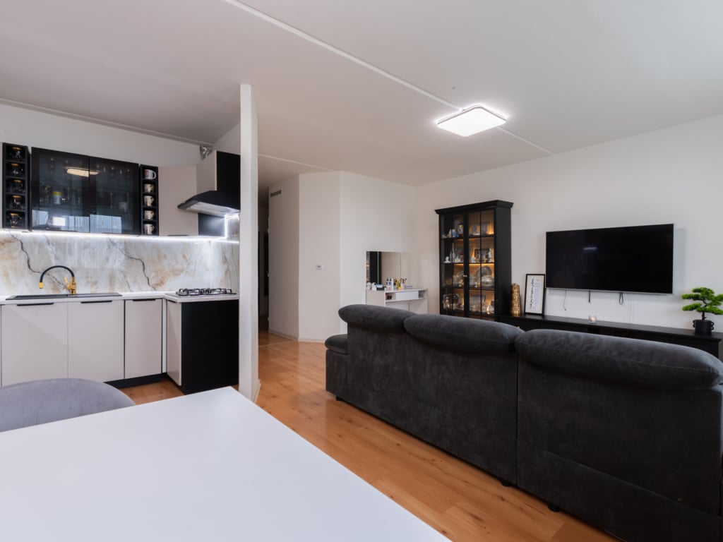 Byt prošel kompletní rekonstrukcí. Byl dispozičně velice pěkně a účelně upraven tak, aby vznikly prostorné místnosti, obývací pokoj je vzdušný a propojený s jídelnou a kuchyní.